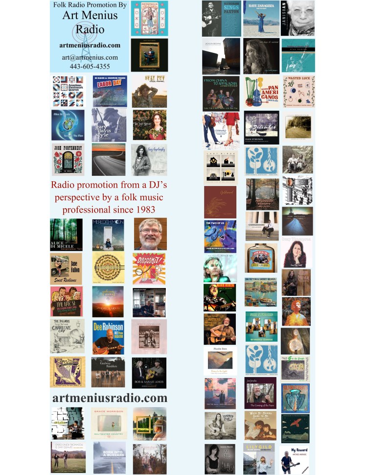 Art Menius Radio provides comprehensive digital and physical recording promotion focused on the FAI Folk Chart and NACC Folk Chart. This can be inclusive of all printing and mailing costs.